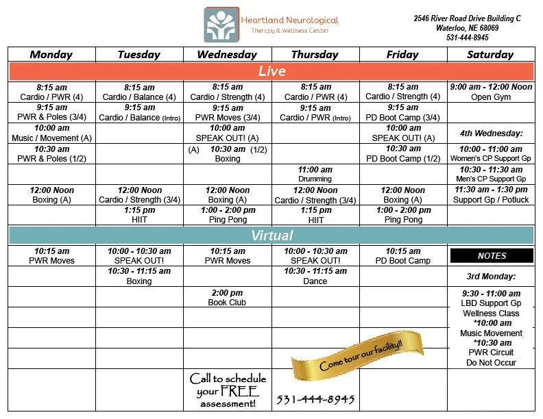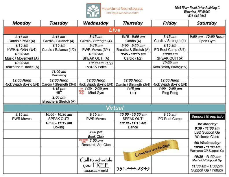 Come to get to know your new community! This 30 minute class introduces you to the staff, facility, class schedules and registration. Also, the different Parkinson’s specific Best Practice models of care used at Heartland will be introduced. We welcome and encourage you to bring your care partner.